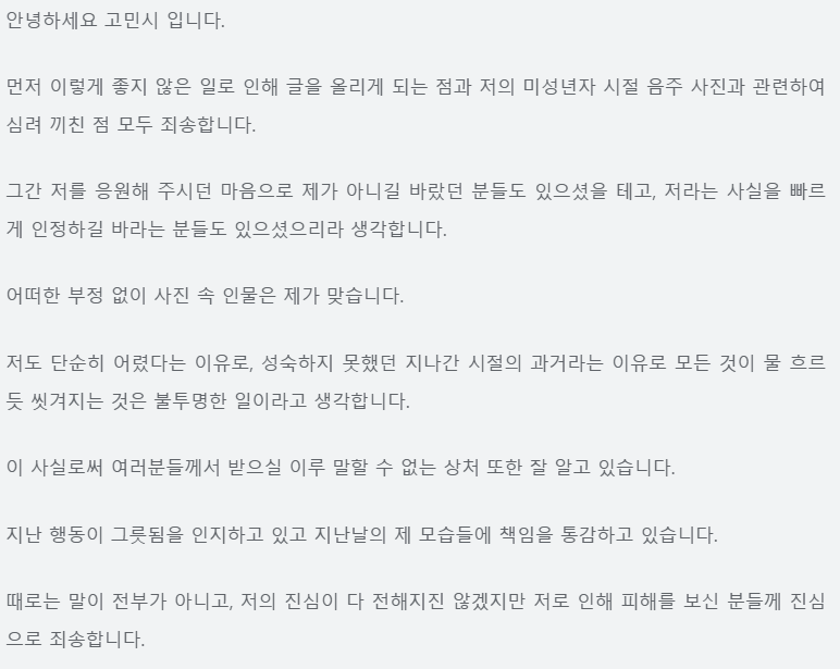 과거 음주 사실에 대해서는 고민시가 빠른 사과문을 통해 잘못을 인정한 바 있습니다.