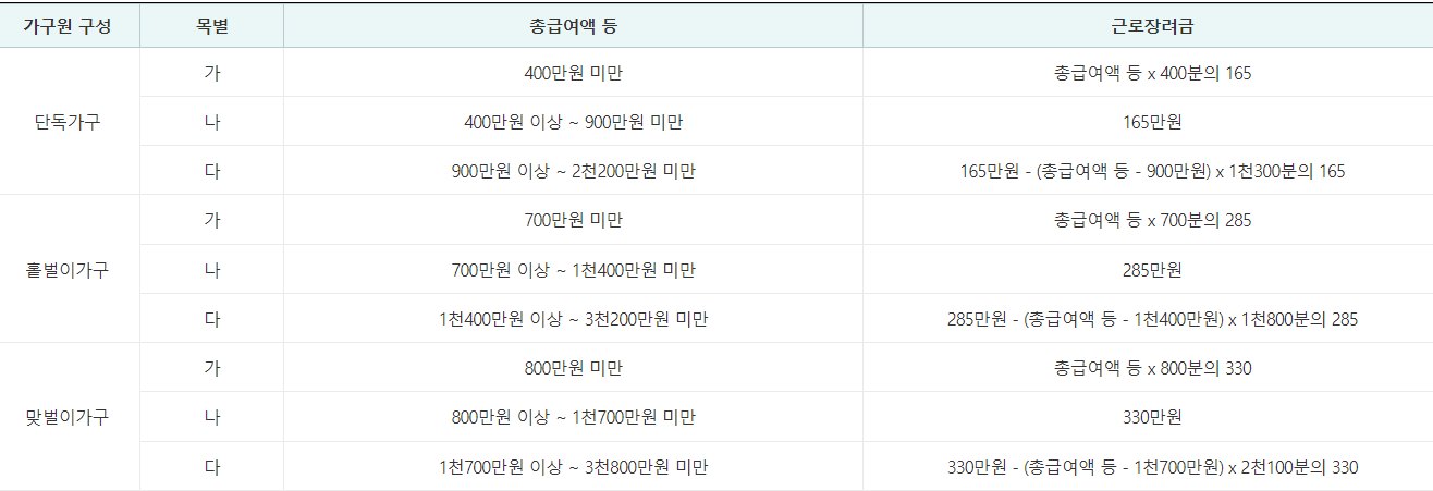 1) 근로 장려금을 받을 수 있는 자격은 연간 부부 합산 총 소득금액에 따라 확인하실 수 있습니다.