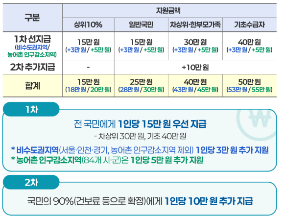 1차 신청은 2025년 7월 21일부터 9월 12일까지, 2차 신청은 9월 22일부터 10월 31일까지 진행됩니다. 1차 신청에서는 전 국민이 대상이며, 2차 신청에서는 국민 90%를 대상으로 추가 지원이 이뤄집니다. 차상위계층, 한부모가족, 기초생활수급자 등은 더 높은 금액이 지급되며, 비수도권 지역 주민에게는 추가 지원이 제공됩니다.
