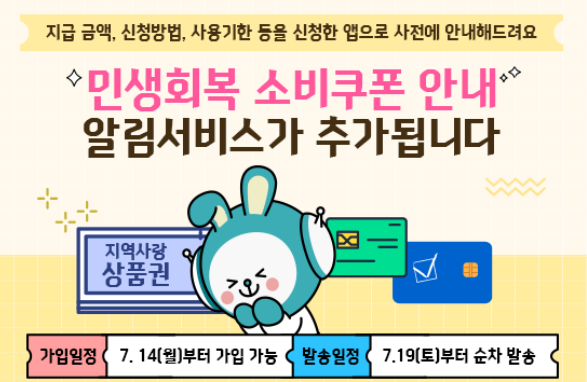 신청 개시 일주일 전인 14일부터는 네이버앱, 카카오톡 등으로 '사전 알림' 서비스를 신청할 수도 있습니다. 서비스를 요청한 국민에게는 7월 19일부터 차례대로 지급 대상 여부, 지원 금액, 신청 방법 등을 안내합니다.