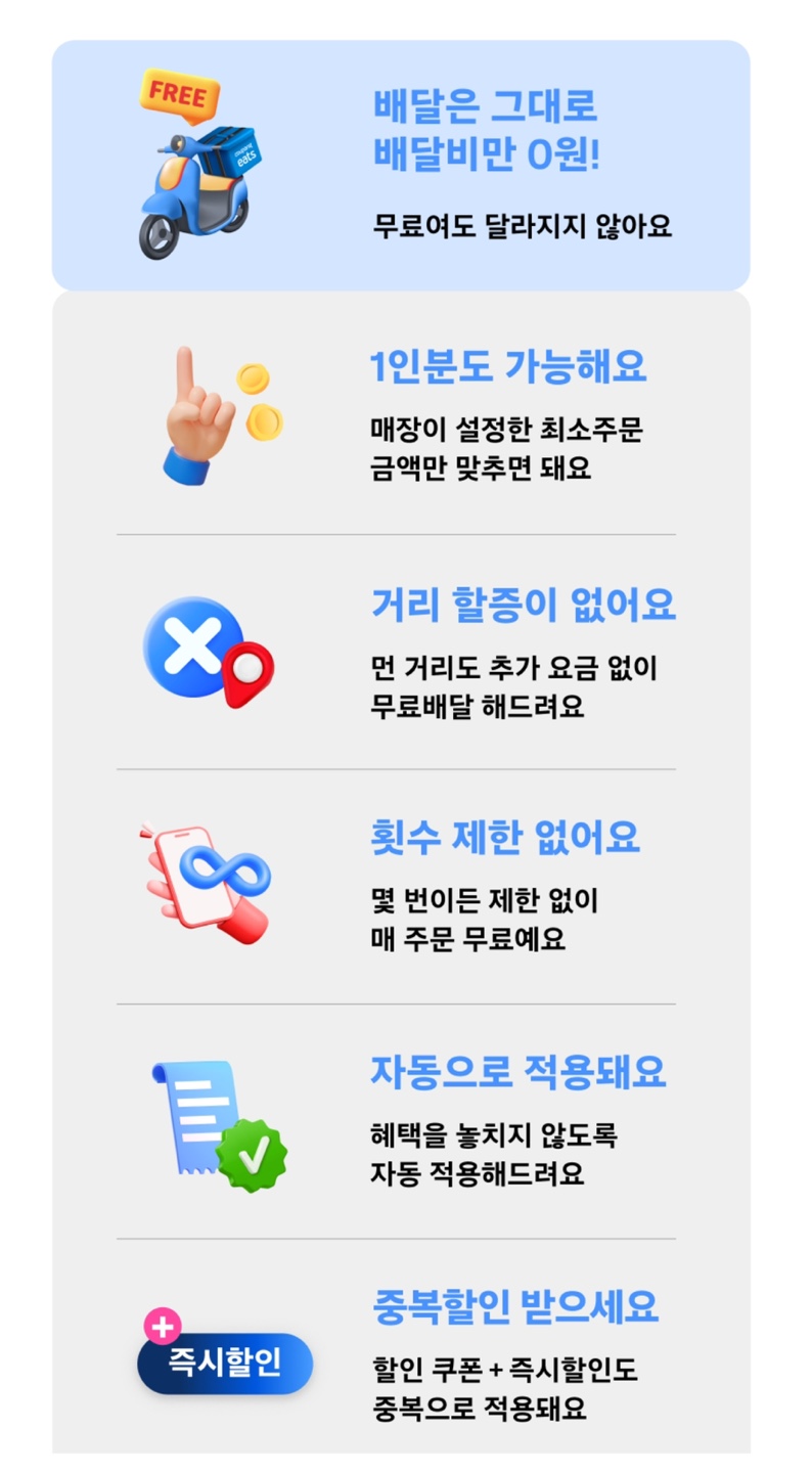 매장별 최소 주문 금액만 맞추면, 거리 할증에 따른 추가 요금이 없고, 횟수 제한도 없습니다.
